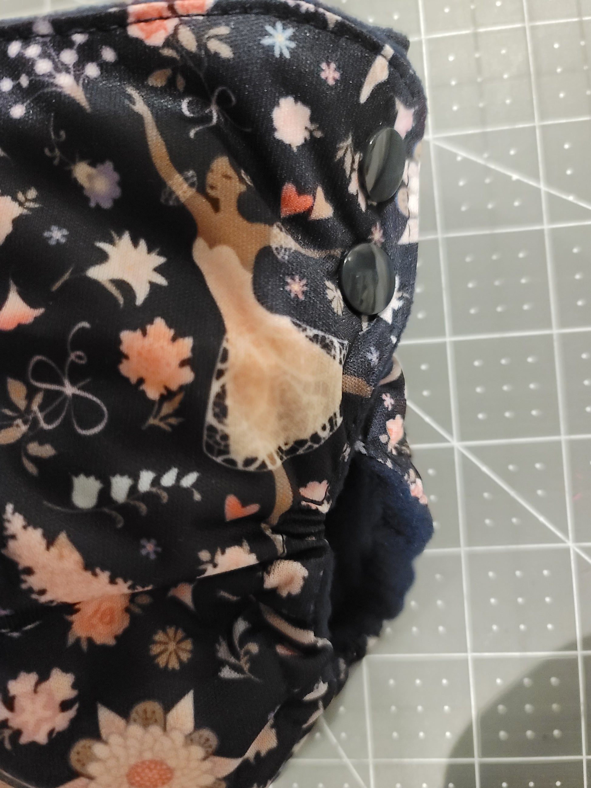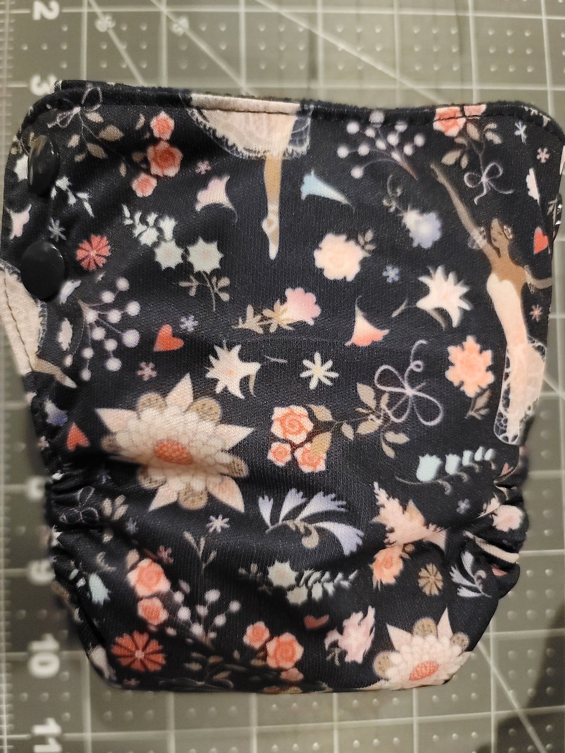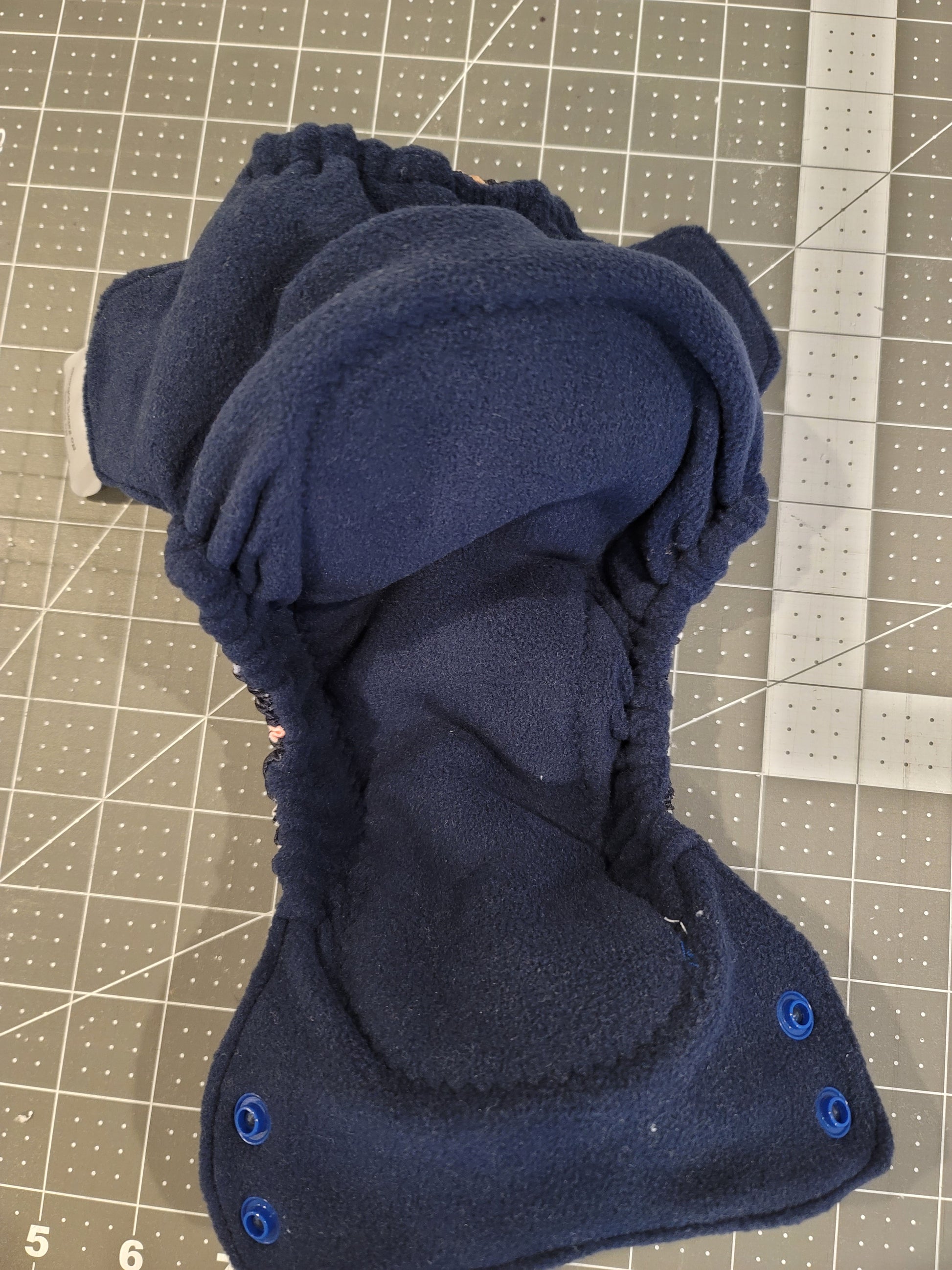All in one newborn diaper with side snap closure fits babies from approximately 6-12 pounds. PUL outer fabric and moisture wicking microfleece lining. Sewn in soaker layers consists of bamboo/cotton fleece, hemp/organic cotton fleece, and cotton fleece. Made in the USA.