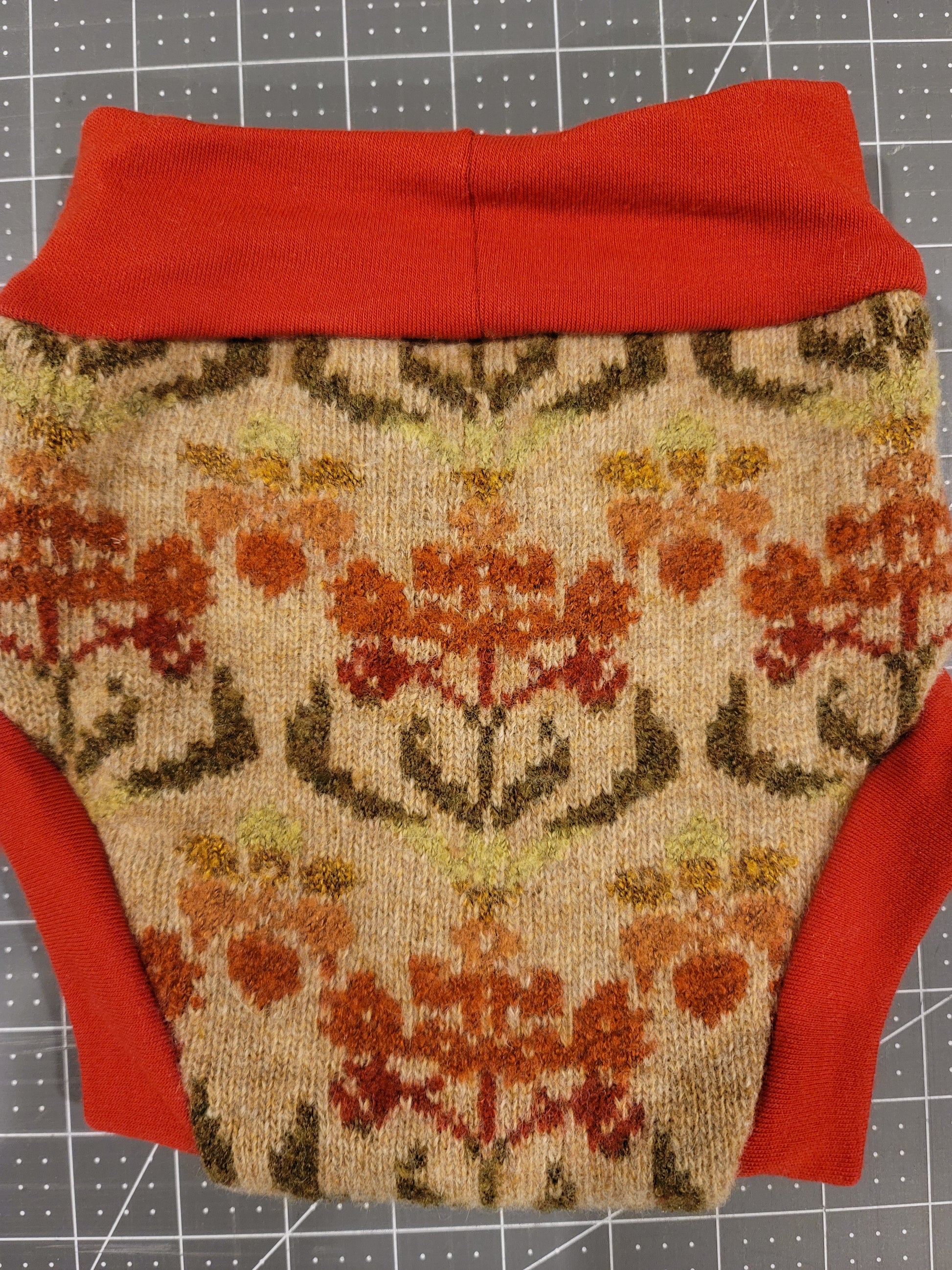 Medium wool diaper cover fits babies from approximately 6-12 months. Outer is made from an upcycled wool sweater. Waistband, leg bands, and lining are from New merino wool interlock fabric. Lanolinize before initial use. Hand wash cold water and lay flat to dry. Do not twist or wring.